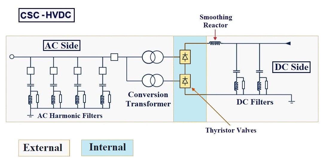 - The primary components of the HVDC converter stations are presented for both VSC technology (particularly the use of phase reactor and DC capacitors) and CSC technology (particularly the use of DC and AC filters);