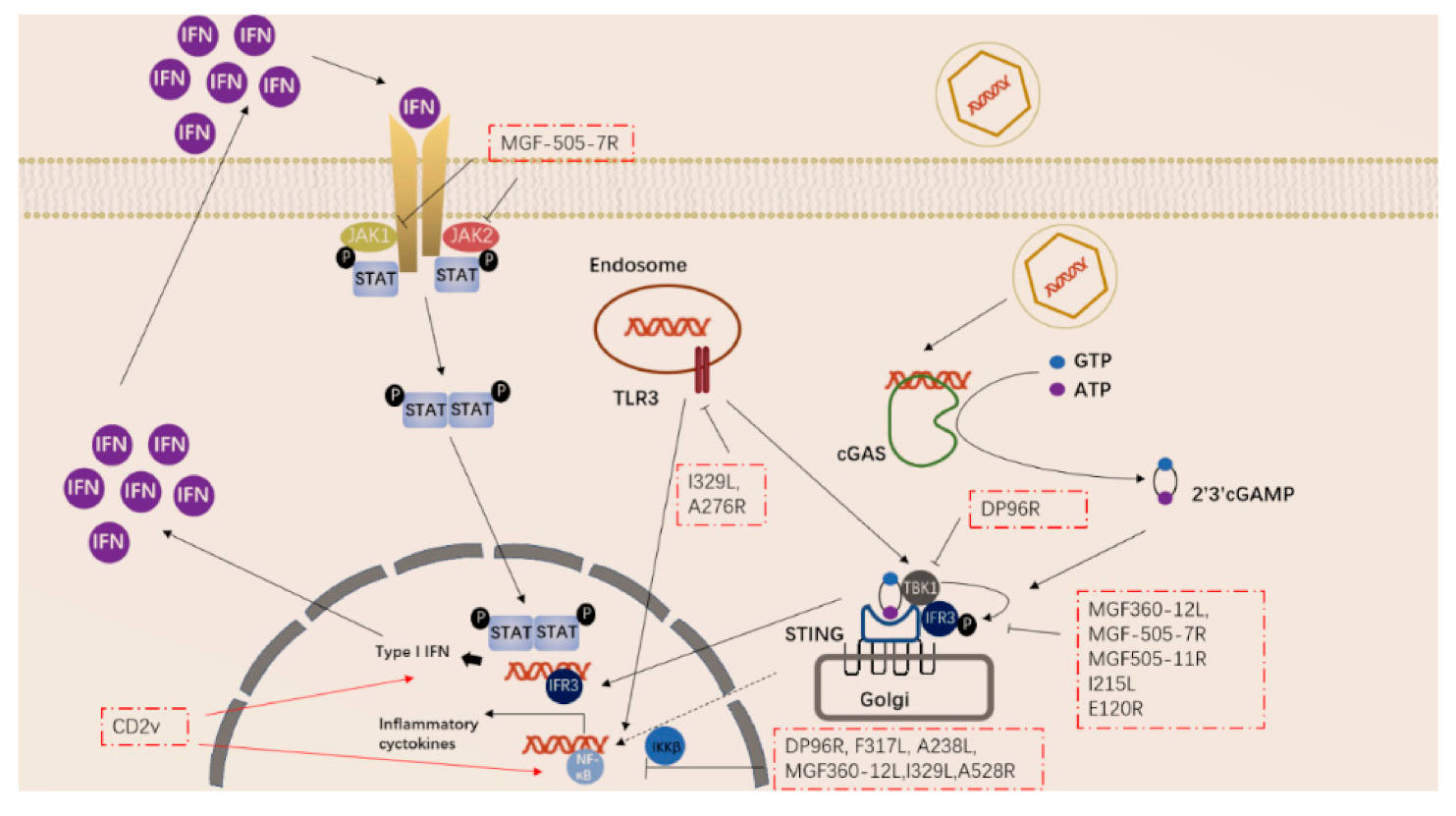 ASFV encodes multiple genes involved in suppressing the cGAS-STING signaling pathway. In 2013, Correia et al. reported that A528R (MGF530) could inhibit the expression of IFN-β by targeting IRF3 and NF-κB or through the JAK-STAT pathway