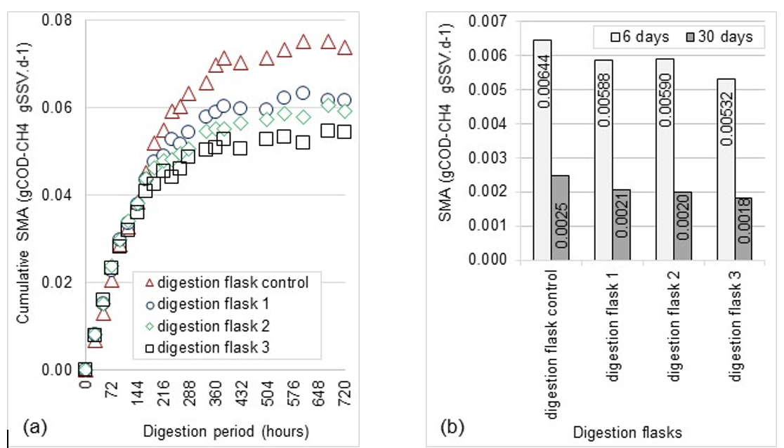 The values of SMA of Figure 2b show that there was negative interference of WTR in the production of methane gas along the two scenarios (6 and 30 days of digestion). However, production of gas still occurred, suggesting that some methanogenic microorganisms were physiologically active even in the presence of aluminium oxides.