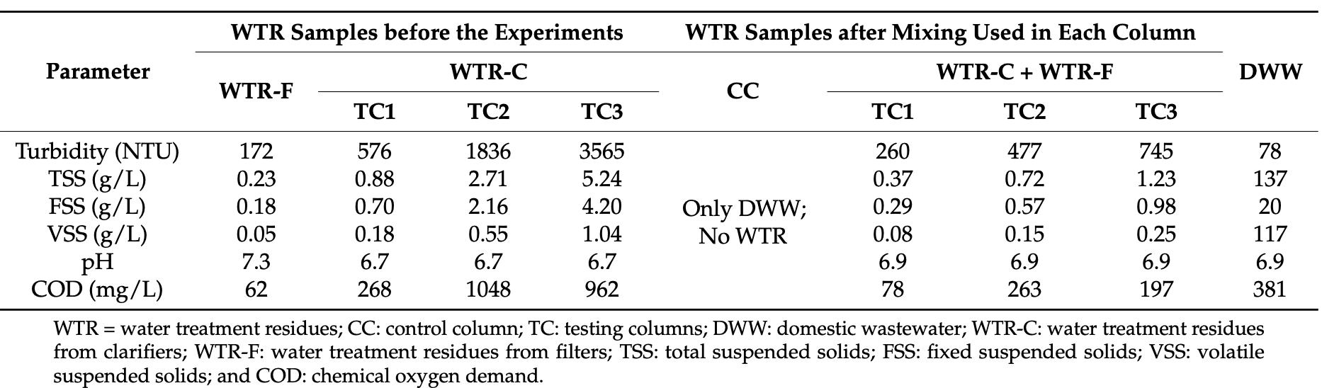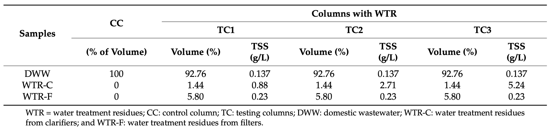 Table 1. Volumes of WTR and DWW used in the sedimentation experiments.