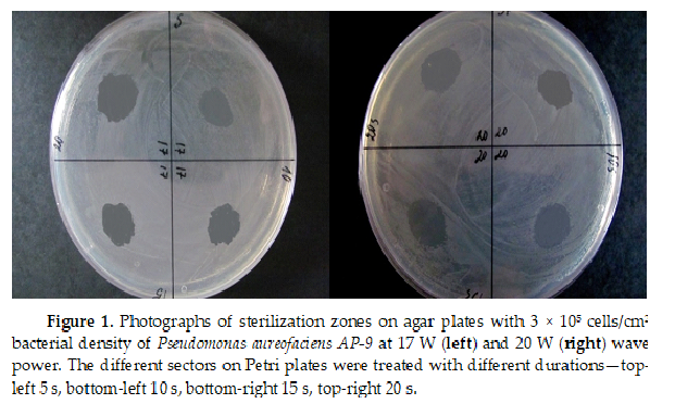 The used plasma source had a clear sterilization effect on films of Pseudomonas AP-9, even at the shortest treatment time of 5 s. The boundaries of the zones were differentiated and the sterilization effect at this bacterial number (3 × 105 cells/cm2) was very stable (Figure 1). Our observations showed the absence of bacterial growth for more than 168 h in the zones, which maintained their sizes and purity.