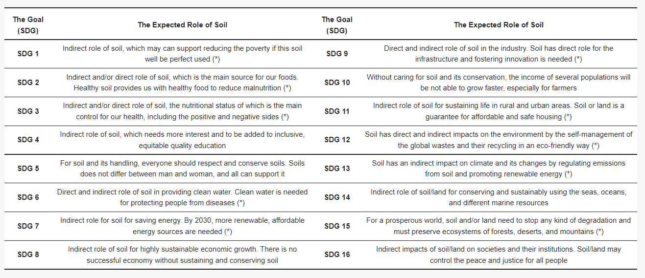 Table 1. The main Sustainable Development Goals (SDGs), which launched by the United Nations and the expected role of soil. Soils may have a significant contribution meeting directly and/or indirectly almost all United Nation’s sustainable development goals (*).