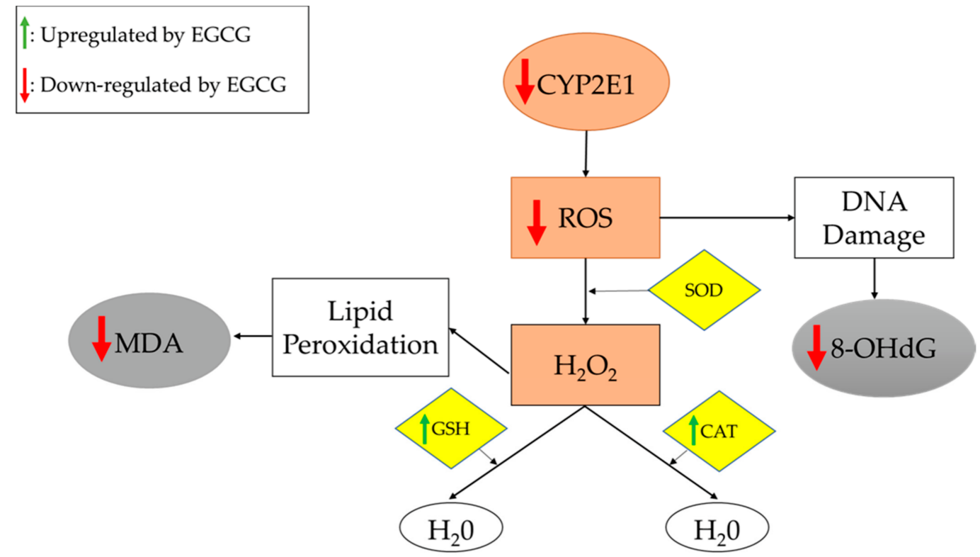 ↓ MDA, 8-OHdG, GST-P+, d-ROM, CYP2E1; ↑ GPx, CAT |