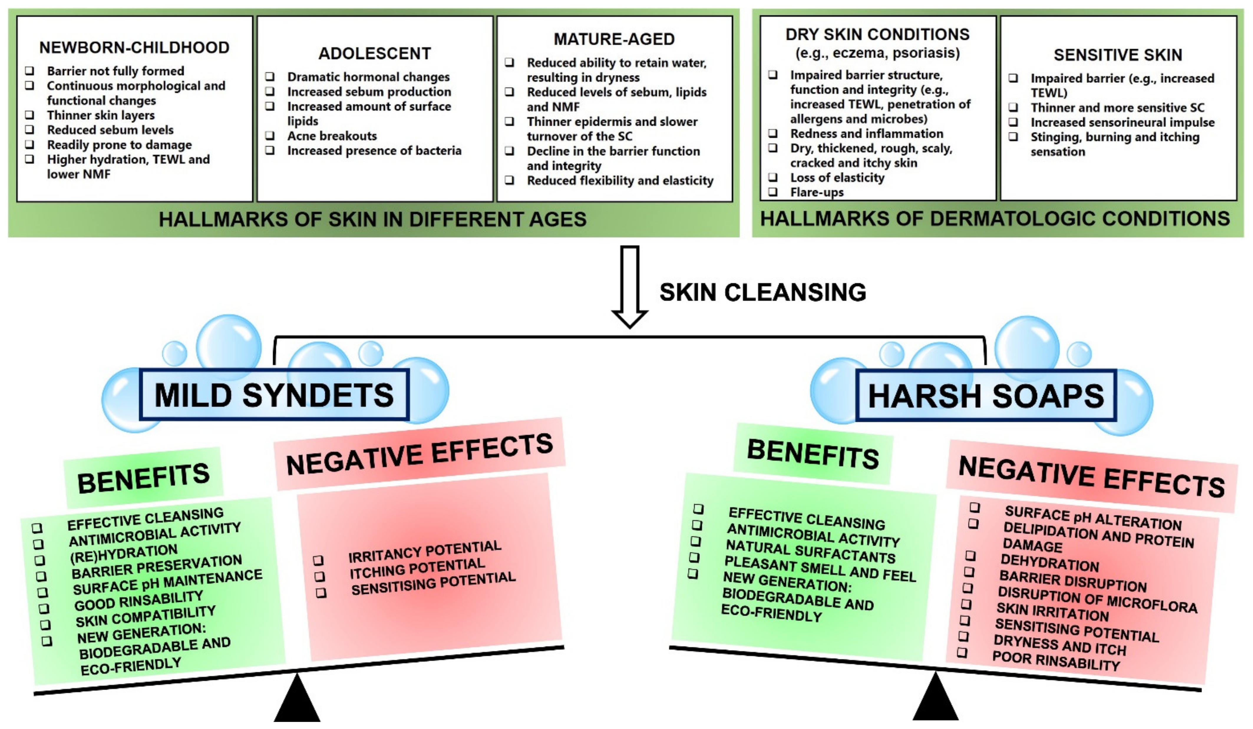 Figure 2. Benefits and negative effects of mild syndets and harsh soaps exhibited on the skin in different ages and common dermatologic conditions