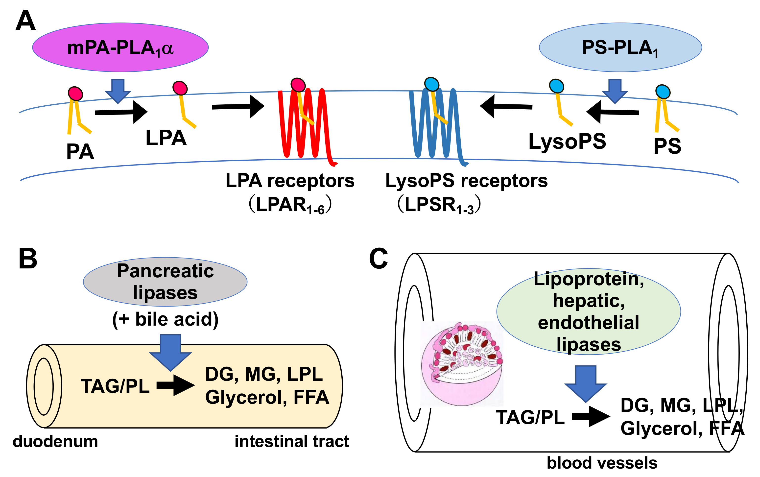 Figure 3. Physiological roles of extracellular PLA1s. (A) PS-PLA1 and mPA-PLA1α serve as producing enzymes for lysophospholipid mediators. PS-PLA1 has a strict substrate specificity in that it only acts on serine containing GPLs such as phosphatidylserine (PS) and lysophosphatidylserine (LysoPS). LysoPS then acts on GPCR-type LysoPS receptors. Three such LysoPS receptors have been identified. These include LPSR1/GPR34, LPSR2/P2Y10, and LPSR3/GPR174. mPA-PLA1α acts on PA in a specific manner and produces sn-2 LPA, which then acts on GPCR-type LPA receptors, LPAR1-LPAR6 evoking various biological responses. (B) Pancreatic lipase (PL) is secreted from the pancreas into the lumen of the intestine, where it, with the aid of bile acids, hydrolyzes the fatty acids of triacylglycerol (TAG) and GPLs in the digestive juice yielding diacylglycerol (DAG), monoacylglycerol (MAG) and fatty acids. The liberated fatty acids are absorbed by intestinal cells as nutrients. (C) Lipoprotein lipase (LPL), hepatic lipase (HL), and endothelial lipase (EL), which are mainly present in the blood, are associated with endothelial cell surfaces in adipose tissues (LPL), heart (LPL), liver (HL) and various tissues. These lipases have both TAG lipase and PLA1 activities. They hydrolyze fatty acids of TAG and GPLs present in the circulating lipoproteins such as low-density lipoproteins (LDL) and high-density lipoproteins (HDL), yielding diacylglycerol (DAG), monoacylglycerol (MAG), lysophospholipids (LPL) and fatty acids. The free fatty acids are absorbed by corresponding cells for energy source and storage of neutral lipids.