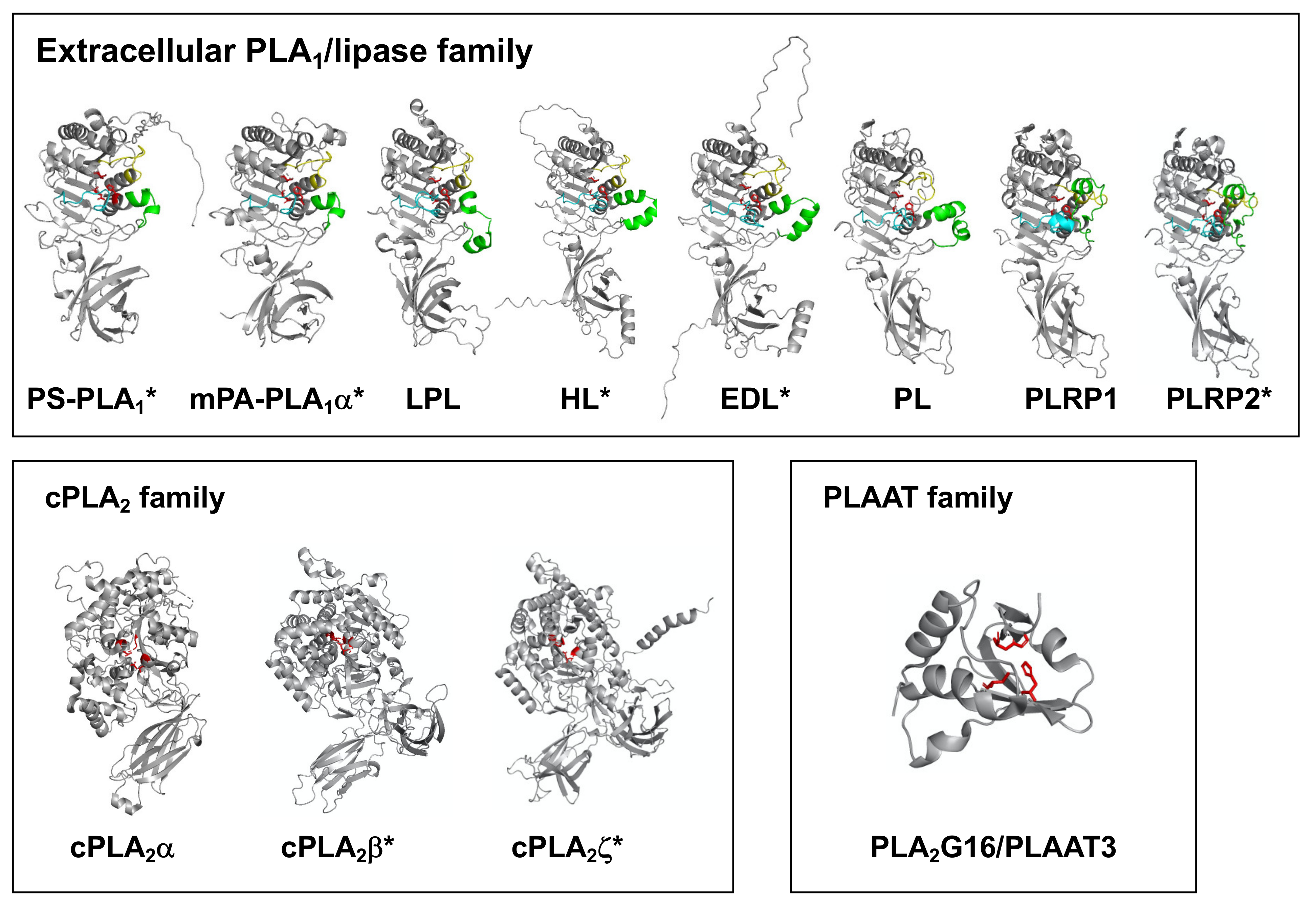 Figure 4. Structures of PLA1 molecules. 3D structures of three PLA1 family members (extracellular PLA1/lipase, cPLA2 and PLAAT family members) were shown. For extracellular PLA1/lipase family members, β5 and the β9 loops and the lid domain are shown in yellow, cyan and green, respectively. The three residues forming a catalytic triad (Ser, Asp and His) are described as sticks (red). For cPLA2 family members (cPLA2α, cPLA2β and cPLA2ζ), the conserved lipase motifs (GXSGX and DXG) are shown in red, and the two residues forming a catalytic dyad (Ser and Asp) are shown as sticks. For PLAAT3/PLA2G16, the three residues forming a catalytic triad (two histidines and cysteine) are shown as sticks (red). The structures without asterisk were acquired from RCSB Protein Data Bank. (Reference PDB IDs; PL (1LPB), LPL (6OB0), PLRP1 (2PPL), cPLA2α (1CJY), PLA2G16 (4DOT)). The predicted structures of lipases with asterisk were acquired from AlphaFold Protein Structure Database. All the structures were visualized using PyMOL software.