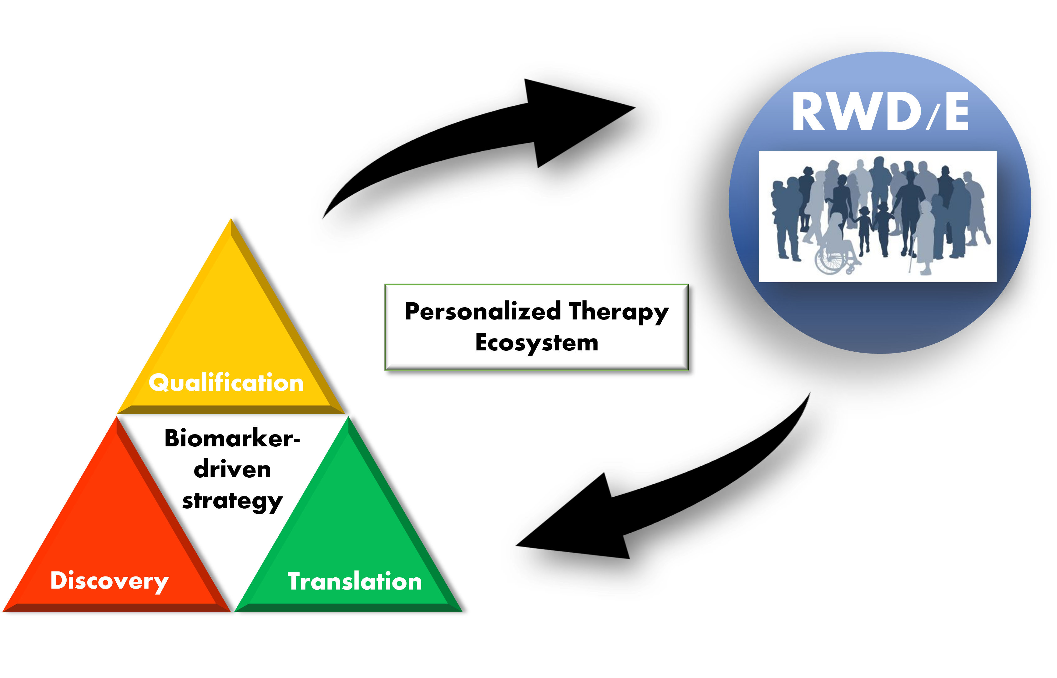 Figure 1. Personalized therapy ecosystem (PTE). A pictorial representation of a PTE. A biomarker “lifecycle” is broken down into 3 stages – discovery, translation, and qualification. Biomarker testing in the clinic generates real-world data/evidence (RWD/E) that feeds back into (supports) all stages of biomarker-driven drug development. Increased efficiency in development leads to more clinically validated biomarkers that can be used in clinical practice.