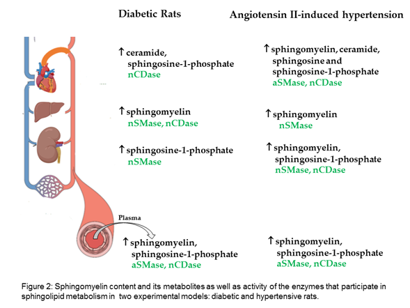 Researchers evaluated the sphingomyelin content and its metabolites in two experimental models: diabetic and hypertensive rats. The results show that, in the plasma and liver of diabetic rats, sphingomyelin is increased; in the heart, ceramide; and in the kidney, S1P. Moreover, increased sphingomyelin was observed in the plasma and all evaluated organs of hypertensive rats, as well as increased ceramide and sphingosine in the heart, and increased S1P in the plasma, kidney, and heart (Figure 2).