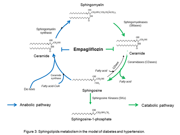 The results suggest that empagliflozin downregulates the interaction of the de novo pathway and the catabolic pathway of sphingolipid metabolism in diabetes, whereas, in Ang II-dependent hypertension, it only downregulates the sphingolipid catabolic pathway (Figure 3).