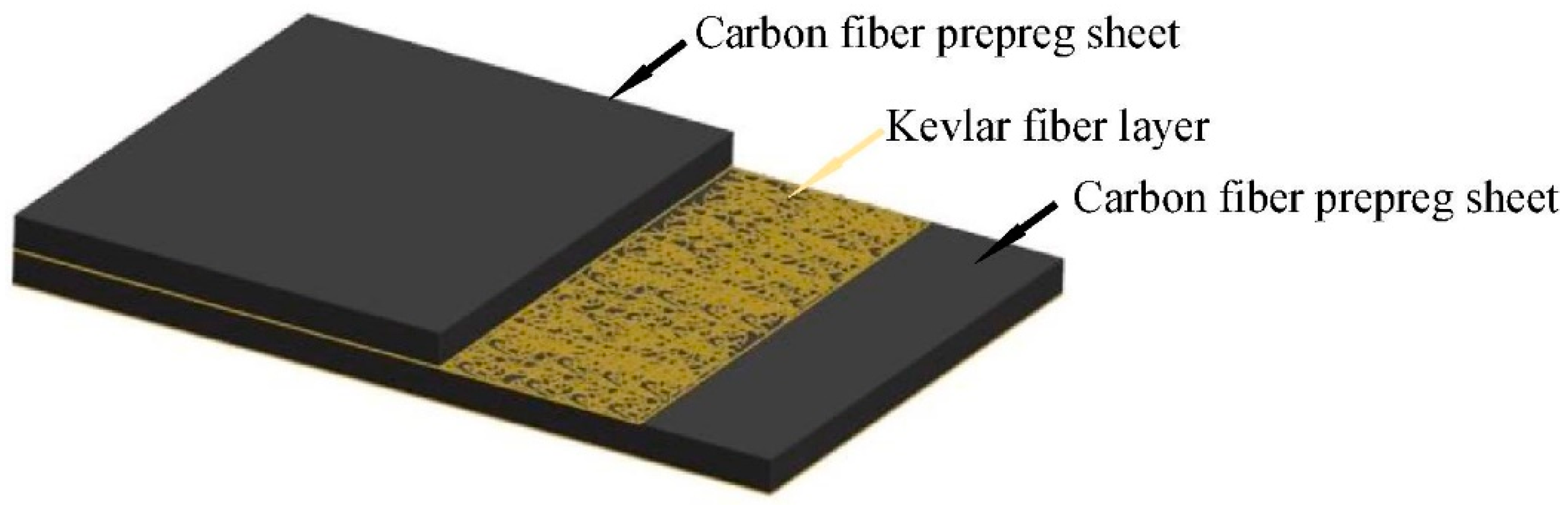 Figure 3. Structure of composite laminate with Kevlar-fiber toughening. The sandwich structure was adopted, with a carbon fiber prepreg sheet at the top and bottom and a Kevlar-fiber layer in the middle
