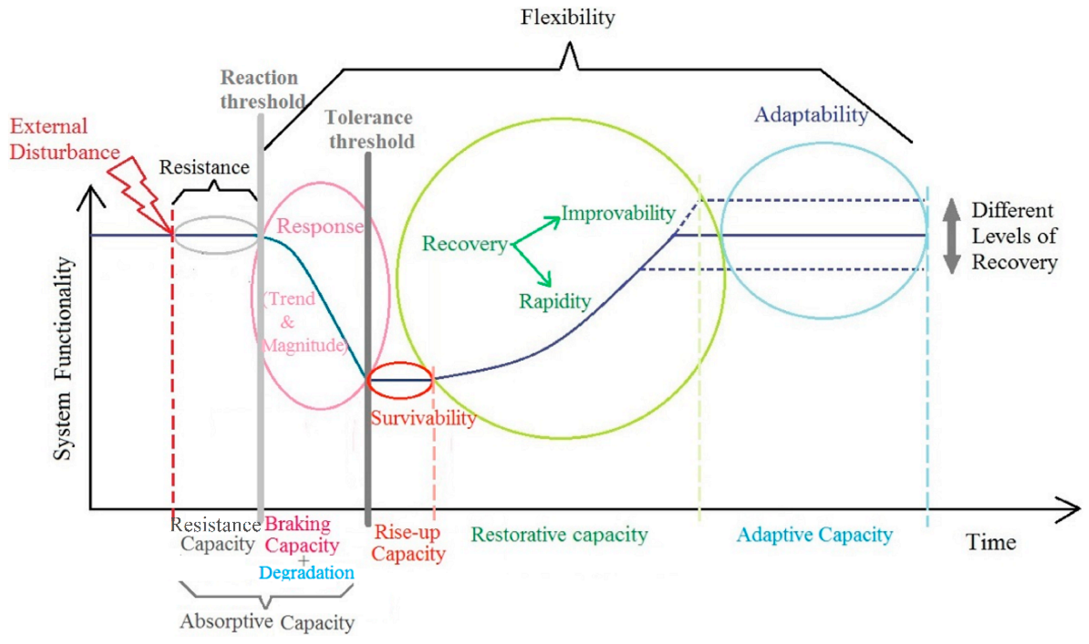 [17][18][19][20,21,22]. At the end of the response process, when the system performance reaches its minimum level possible, the “tolerance threshold” occurs, which means a threshold where the system cannot bear the disturbance anymore. This is why before this threshold, a part of the disturbance could be absorbed by the system alongside the performance degradation. In fact, the “tolerance threshold” is located before the maximum failure of the system. Apart from the two mentioned thresholds, a third could be identified in the system behavior curve, which is called the “non-recovery” threshold and is not determined in