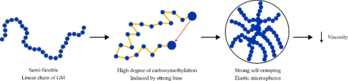 Several methods have obtained GM with low Mw, for example, depolymerization, such as deacetylation, and carboxymethylation with strong bases to break the glycosidic bonds [67]. The viscosity of GM at 25 °C decreased significantly from 4660 cps to <500 cps after modification [2][50].Several methods have obtained GM with low Mw, for example, depolymerization, such as deacetylation, and carboxymethylation with strong bases to break the glycosidic bonds [66]. The viscosity of GM at 25 °C decreased significantly from 4660 cps to <500 cps after modification [2,49].