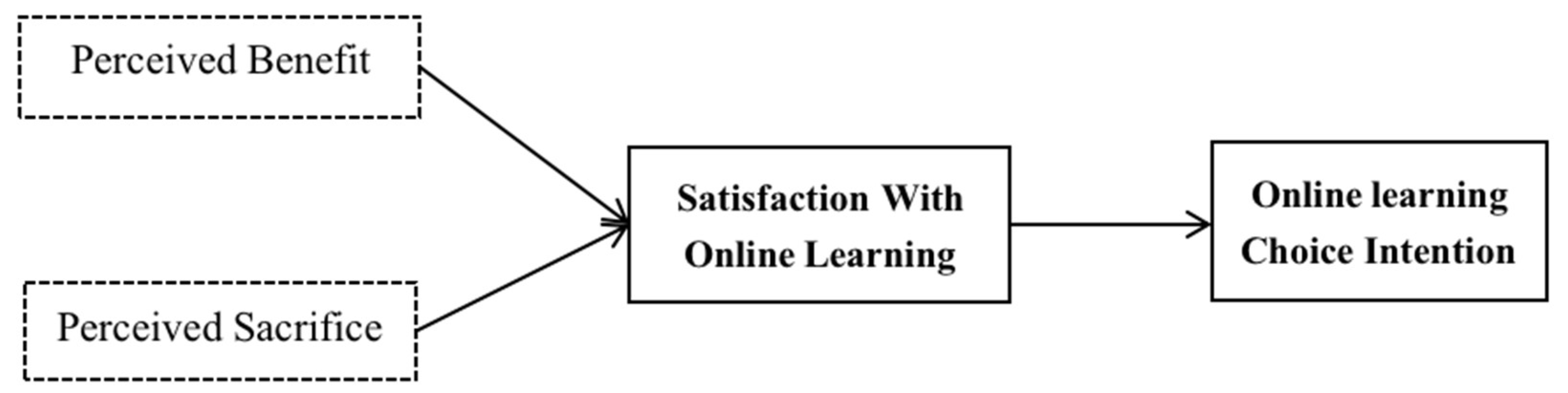 This model has a certain degree of agreement with the study on parents’ intention to choose online learning for primary school students. Parents’ intention to choose online learning means that parents weigh the gains and losses of students’ participation in online learning, comprehensively evaluate the value of online learning, and further decide whether children choose online learning. In this study, the VAM model can be modified and expanded based on the actual technical application scenarios. Firstly, the “adoption intention” in the model is the choice intention of this study. Secondly, “perceived value” is a comprehensive evaluation of parents’ online education experience. In previous literature on online learning and users’ cognition and opinions, “satisfaction” is often used to express and measure learners’ attitudes and opinions towards online learning [12,26–29]. Therefore, the concept of satisfaction is used to represent “perceived value” in the model. There are many factors that affect learners’ satisfaction [12]. This study divides these factors into two aspects: “perceived benefit” and “perceived sacrifice”, as shown in Figure 1.