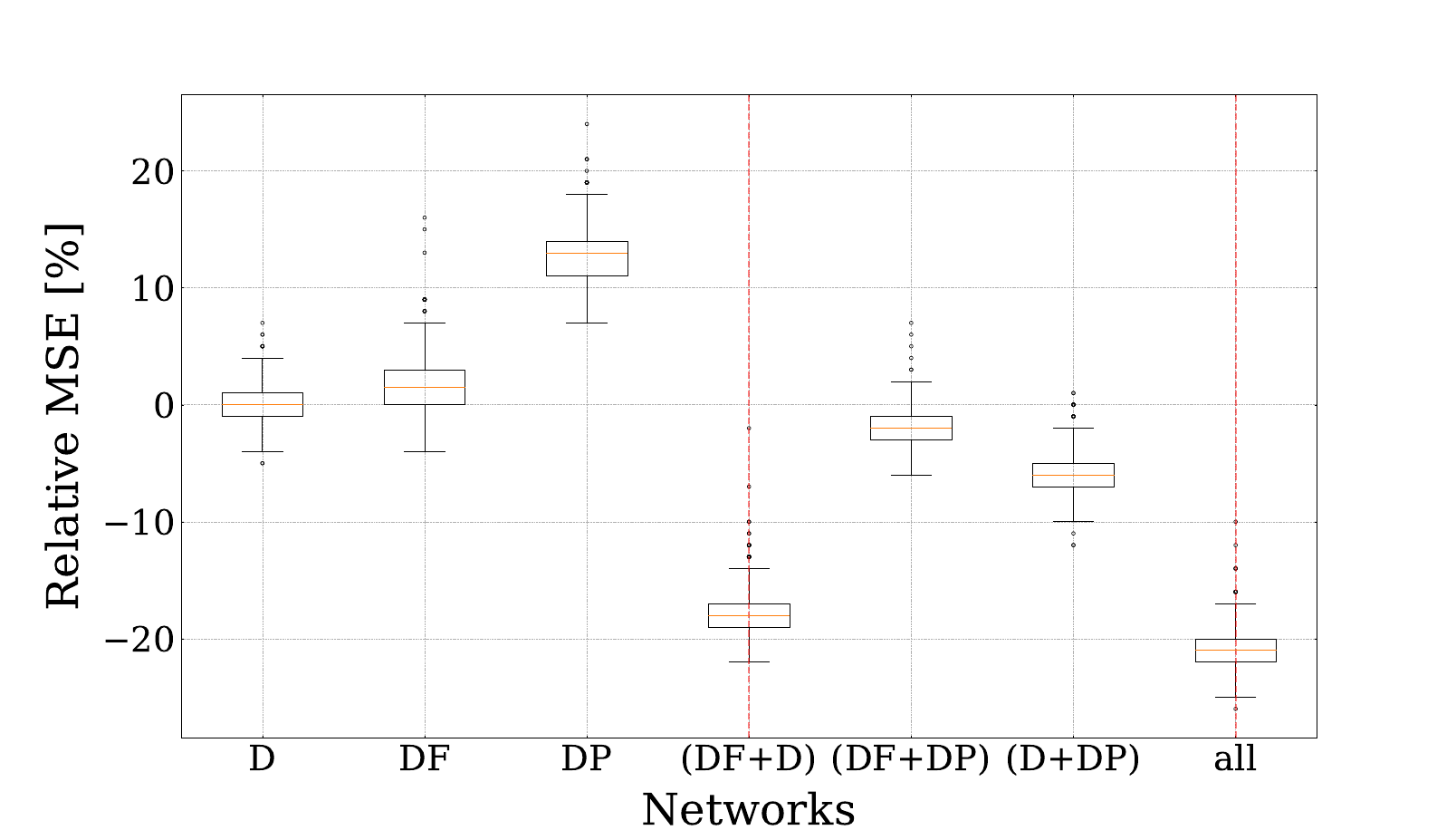 Figure 23. Boxplots represent the training MSE results of the algorithms using UX, N=20, 24, 30 samples with complexity (3,2). The x-axis represents the algorithm inputs we applied, and the y-axis denotes the relative MSE calculated with D-input algorithms as a reference case.