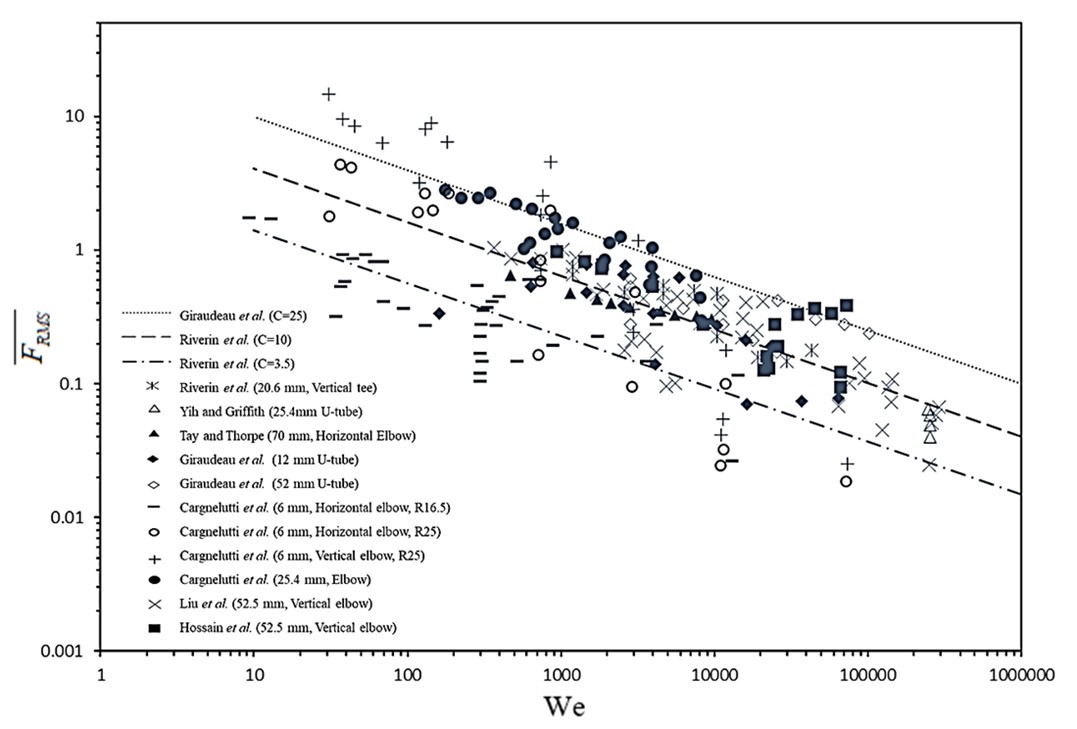 The dashed line shown in Figure 3Figure below is drawn using Riverin equation with C value of 10. This was proposed as a reasonable approximation of dimensionless forces. The dash dotted line shown in Figure is drawn using C of 3.5 and it is the best fit curve for slug flow regime. Giraudeau et al. proposed that to be conservative, an upper bound of dimensionless forces should be defined and from their experiments on 12 to 52 mm internal diameter U-bends, Cmax of 25 was proposed. This corresponds to the dotted line shown in Figure 3Figure . The experimental results for 12 and 52 mm U-bends are included here, which shows that Cmax = 25 is a good approximation for upper limit. The dimensionless forces due to slug flow from experiments conducted by Cargnelutti et al., in 6 mm internal diameter horizontal and vertical elbows for bend radii of 16.5 and 25 and the results for 25.4 mm (1 inch) internal diameter elbow, are also recorded in Figure 3Figure. Notably, both horizontal and vertical elbows are subjected to the horizontal two-phase flow in these experiments. The overall forces on vertical elbow are higher than the horizontal elbow, which was thought to be due to gravity. Notably, forces in vertical elbow are also higher than the maximum limit introduced by Giraudeau et al. at C of 25. The forces due to the 16.5 bend radius are lower than the 25 mm bend radius for the same diameter pipe, which shows that the bend radius affects the forces. Moreover, it can be observed that the forces in 25.4 mm (1 inch) pipe are higher than the 6 mm experiments. This behavior was unusual, considering that the 25.4 mm (1 inch) experiments contained more gas than the 6 mm experiments. Cargnelutti et al. reported that this can also be due to the difference of stiffness of material used (glass vs. perspex). Overall, the results of Cargnelutti experiments show higher forces than the Revirin experiments and results for 25.4 mm bend are higher than C = 10 line. Experimental results for 20 mm internal diameter tee [38][42], for elbow with 70 mm diameter under the horizontal flow [39][98], and for 6 to 25 mm diameter vertical U-tubes, are also reported. All these results are in agreement with Riverin et al. approximation at C of 10. Results for 52.5 mm vertical elbow are also presented and these results are spread over a wide range from C of 3.51 to 25 lines. This can be attributed to the fact that 0 to 100% void fraction was considered, covering a wide range of flow conditions. The simulation results of Hossain et al. for vertical elbow of 52.5 mm diameter are presented and they mostly lie between C of 10 and 25 lines. Figure 3Figure below can serve as a database for comparison and can also be used to validate the simulation results.