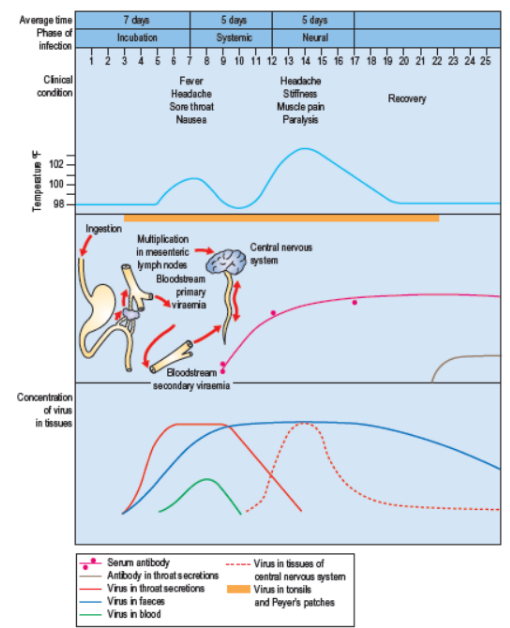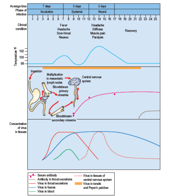 On entering the body, the virus infects and multiplies in the tonsils and Peyer’s patch of ileum.