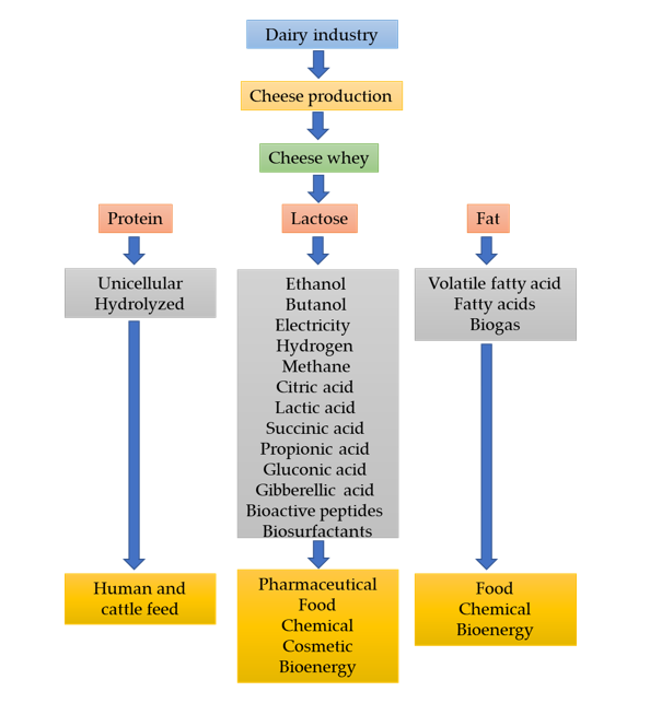 Agro-industrial residues such as bagasse, pomace, municipal residues, vinasse and cheese whey are an environmental problem around the world, mainly due to the huge volumes that are generated because of the food production to satisfy the nutritional needs of the growing world population. Among the above residues, cheese whey has gained special attention because of its high production with a worldwide production of 160 million tons per year. Most of it is discarded in water bodies and land causing damage to the environment due to the high biological oxygen demand caused by its organic matter load. The environmental regulations in developing countries have motivated the development of new processes to treat transform cheese whey into added-value products such as food supplements, cattle feed and food additives.