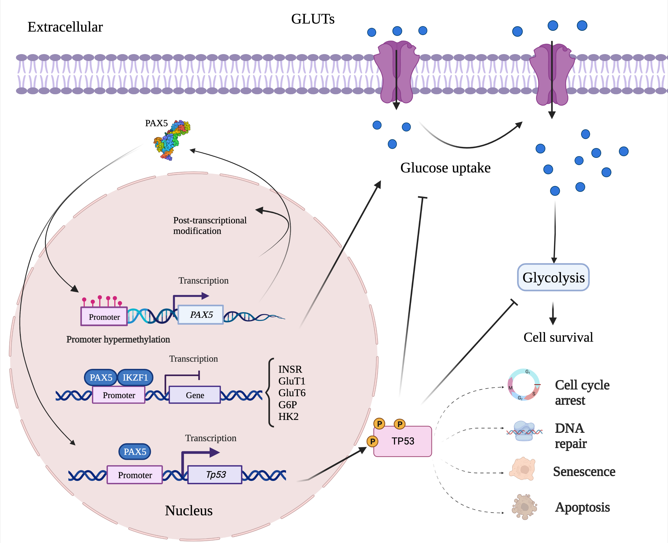 Figure 24. Mutation-independent mechanisms leading to aberrant PAX5 signaling and cell processes. Aside from PAX5 gene sequence alterations, deregulated PAX5 expression can also result from epigenetic events and post-transcription modifications. First, PAX5 gene promoter hypermethylation has been described in many cancers, notably when PAX5 behaves as a tumor suppressor. Post- transcriptional modifications (e.g., coding exon alternative splicing, 3′UTR shortening, and RNA circularization) also contribute to overall PAX5 expression and function. The net production of functional PAX5 transcription factors can thereafter collaborate with IKZF1 to regulate downstream metabolic genes to limit glucose uptake and energy supply required for oncogenic transformation. Adequate PAX5 function is also required to regulate Tp53 expression and avoid uncontrolled cancer phenotypes. Tp53 is also intimately linked to metabolic disfunction leading to cancer processes.