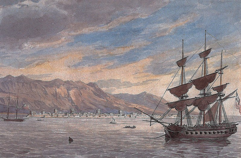 A painting depicting the British Expeditionary Force of 1809 off the coast of Ras Al Khaimah in 1809. By Charles Hamilton - The Myth of Arab Piracy in the Gulf, Public Domain, https://commons.wikimedia.org/w/index.php?curid=73438474There is considerable debate locally regarding the 18th-century charge of maritime piracy, attracting the United Kingdom label 'The Pirate Coast' to the Eastern Gulf. Local interpretations of the dispute with the British were that the British became increasingly aggressive in protecting their trade but this resulted in interference in locals' livelihoods, so they naturally took exception to it.[5] However, in the early 18th century, the Al Qasimi dynasty established itself in Ras Al Khaimah and Sharjah on the Arabian Peninsula, growing to become a significant maritime force with holdings on both the Persian and Arabian coasts that frequently came into conflict with British flagged shipping.