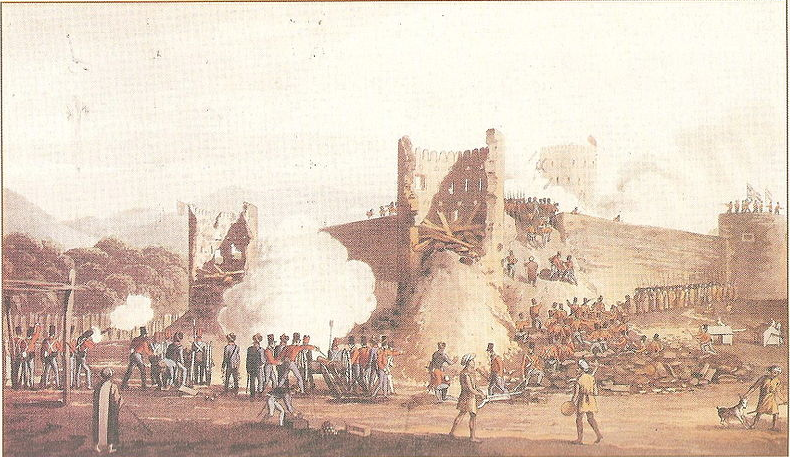 The two 24-pound cannon from HMS Liverpool which had been used to bombard Ras Al Khaimah from the landward side were once again pressed into use and dragged across the plain from Rams, a journey of some four miles. Each of the guns weighed over 2 tonnes. After enduring two hours of sustained fire from the big guns, which breached the fort's walls, the last of the Al Qasimi surrendered at 10.30 on the morning of 22 December.[13]