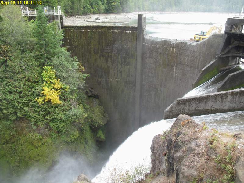 When Elwha Dam was built, it was secured to the walls of the bedrock canyon, but not to the bedrock underlying the river substrate. In 1912, shortly after the reservoir (Lake Aldwell) filled, pressure at the base of the dam built up so much that the foundation of the dam blew out. The void under the dam was plugged by adding fill material to the river below and upstream of the dam. Elwha Dam became operational in 1913.[6] Because of this and other reasons, this dam did not receive a federal license to operate.