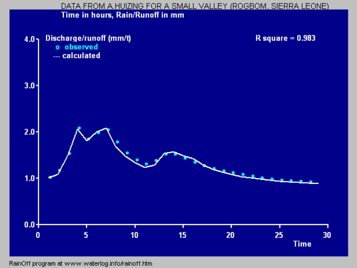 Figures 3 and 4 were made with the RainOff program,[8] designed to analyse rainfall and runoff using the non-linear reservoir model with a pre-reservoir. The program also contains an example of the hydrograph of an agricultural subsurface drainage system for which the value of A can be obtained from the system's characteristics.[9]