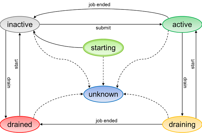 | DRAINING | operators perform drain command to node, to block any processing, but the node was ACTIVE and a job is still running | |