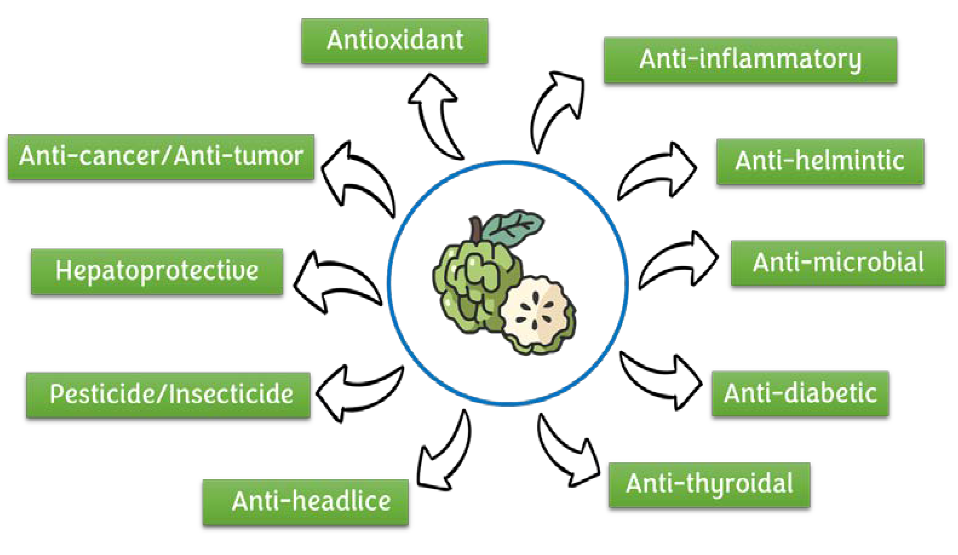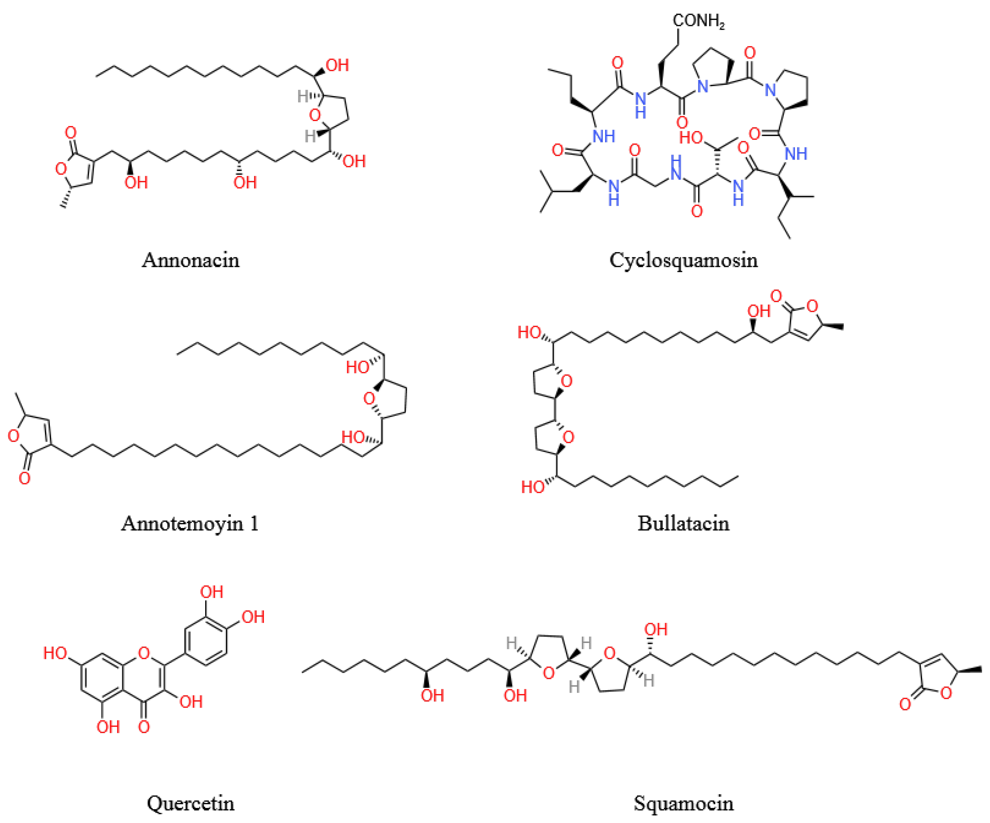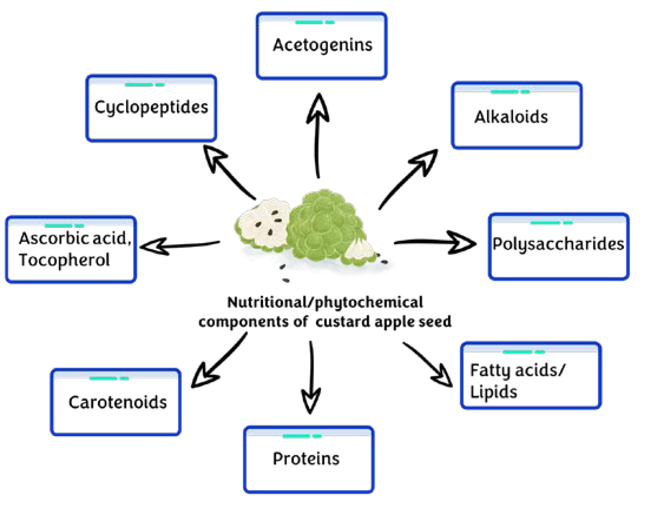 Annona squamosa L. (custard apple or sugar apple), belonging to the Annonaceae family, is a small tree or shrub that grows natively in subtropical and tropical regions. Seeds of the custard apple have been employed in folk medicines because of the presence of bioactive chemicals/compounds such as alkaloids, flavonoids and phenolic compounds and acetogenins and cyclopeptides that are responsible for various biological activities. The seeds also show the presence of tannins, vitamin C, vitamin E and a higher content of amino acids. From investigations, it has been shown that the seeds of A. squamosa have considerable potential to be used as an antibacterial, hepatoprotective, antioxidant and antitumor/anticancer agent. Cyclosquamosin B, extracted from the custard apple seed, possesses vasorelaxant properties. Tocopherols and fatty acids, notably oleic acid and linoleic acid, are also found in the seed oil. A. squamosa seeds contain a high amount of annonaceous acetogenins compounds, which are potent mitochondrial complex I inhibitors and have high cytotoxicity. A survey primarily based on the nutritional, phytochemical and biological properties showed that A. squamosa seeds can be used for the discovery of novel products, including pharmaceutical drugs.