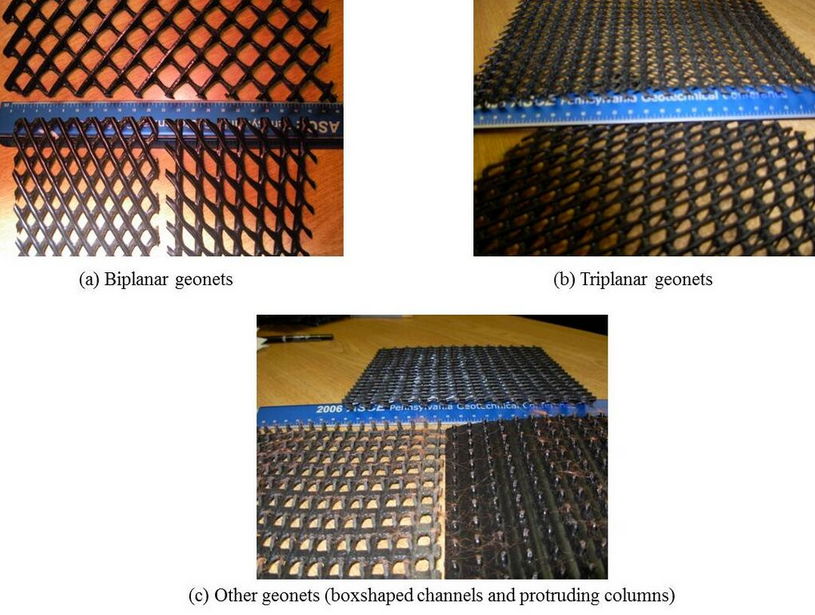 Geonets are formed by a continuous extrusion process into a netlike configuration of parallel sets of homogeneously interconnected ribs. There are three categories of geonets. The following are illustrated: