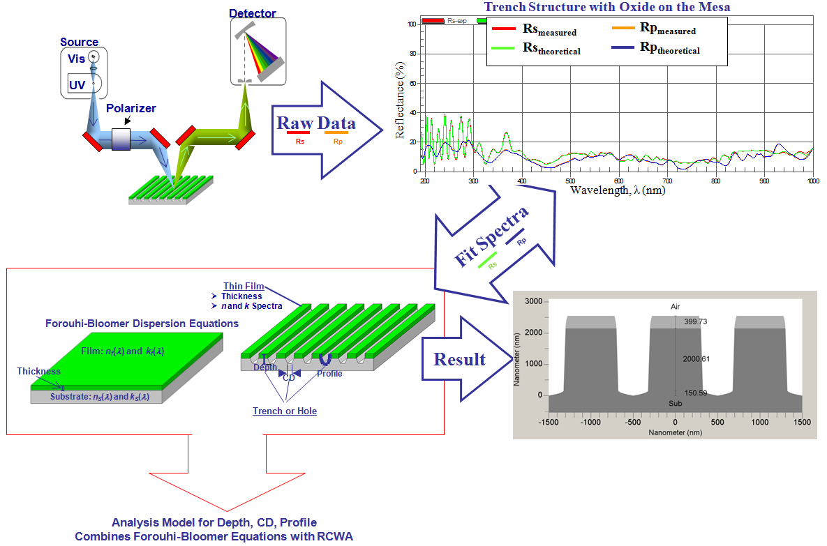 The Forouhi–Bloomer dispersion equations in combination with Rigorous Coupled-Wave Analysis (RCWA) have also been used to obtain detailed profile information (depth, CD, sidewall angle) of trench structures. In order to extract structure information, polarized broadband reflectance data, Rs and Rp, must be collected over a large wavelength range from a periodic structure (grating), and then analyzed with a model that incorporates Forouhi–Bloomer dispersion equations and RCWA. Inputs into the model include grating pitch and n and k spectra of all materials within the structure, while outputs can include Depth, CDs at multiple locations, and even sidewall angle. The n and k spectra of such materials can be obtained in accordance with the methodology described in this section for thin film measurements.