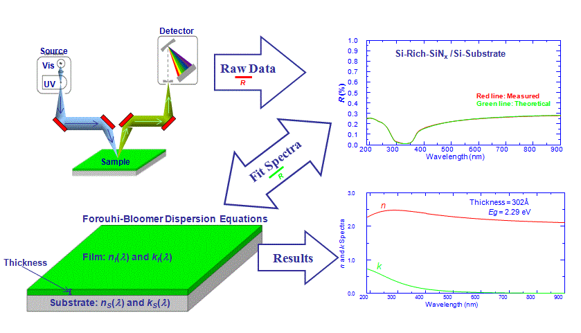 The refractive index (n) and extinction coefficient (k) are related to the interaction between a material and incident light, and are associated with refraction and absorption (respectively). They can be considered as the “fingerprint of the material". Thin film material coatings on various substrates provide important functionalities for the microfabrication industry, and the n, k, as well as the thickness, t, of these thin film constituents must be measured and controlled to allow for repeatable manufacturing.