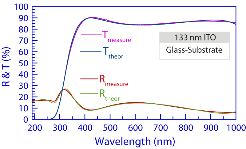Indium tin oxide (ITO) is a conducting material with the unusual property that it is transparent, so it is widely used in the flat panel display industry. Reflectance and transmittance measurements of the uncoated glass substrate were needed in order to determine the previously unknown n(λ) and k(λ) spectra of the glass. The reflectance and transmittance of ITO deposited on the same glass substrate were then measured simultaneously, and analyzed using the Forouhi–Bloomer equations.