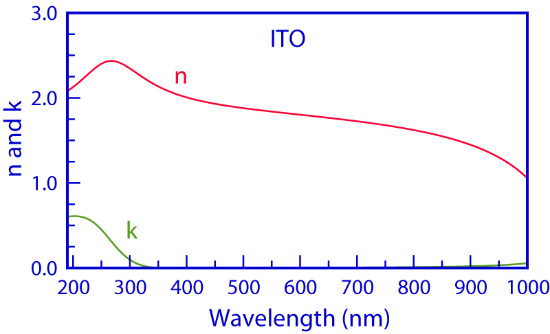 As expected, the k(λ) spectrum of ITO is zero in the visible wavelength range, since ITO is transparent. The behavior of the k(λ) spectrum of ITO in the near-infrared (NIR) and infrared (IR) wavelength ranges resembles that of a metal: non-zero in the NIR range of 750–1000 nm (difficult to discern in the graphics since its values are very small) and reaching a maximum value in the IR range (λ>1000 nm). The average k value of the ITO film in the NIR and IR range is 0.05.