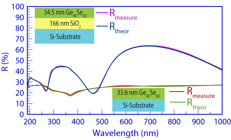 For example, the single measurement of reflectance in 190–1000 nm range of Ge40Se60/Si does not provide unique n(λ) and k(λ) spectra of the film. However, this problem can be solved by depositing the same Ge40Se60 film on another substrate, in this case oxidized silicon, and then simultaneously analyzing the measured reflectance data to determine: