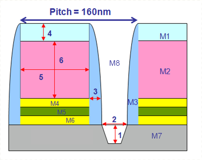 The trench structure depicted in the adjacent diagram repeats itself in 160 nm intervals, that is, it has a given pitch of 160 nm. The trench is composed of the following materials: