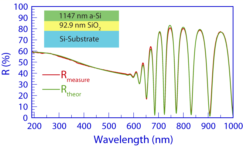 When the measurement involves two or more films in a stack of films, the theoretical expression for reflectance must be expanded to include the n(λ) and k(λ) spectra, plus thickness, t, of each film. However, the regression may not converge to unique values of the parameters, due to the non-linear nature of the expression for reflectance. So it is helpful to eliminate some of the unknowns . For example, the n(λ) and k(λ) spectra of one or more of the films may be known from the literature or previous measurements, and held fixed (not allowed to vary) during the regression. To obtain the results shown in Example 1, the n(λ) and k(λ) spectra of the SiO2 layer was fixed, and the other parameters, n(λ) and k(λ) of a-Si, plus thicknesses of both a-Si and SiO2 were allowed to vary.