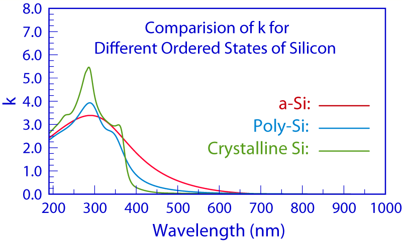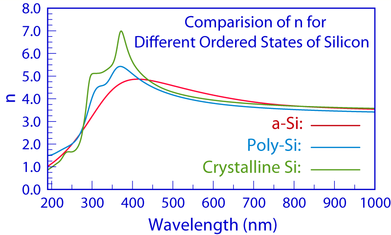 Example 1 shows one broad maximum in the n(λ) and k(λ) spectra of the a-Si film, as is expected for amorphous materials. As a material transitions toward crystallinity, the broad maximum gives way to several sharper peaks in its n(λ) and k(λ) spectra, as demonstrated in the graphics.