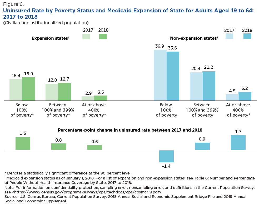 The Census Bureau reported in September 2019 that states that expanded Medicaid under PPACA had considerably lower uninsured rates than states that did not. For example, for adults between 100% and 399% of poverty level, the uninsured rate in 2018 was 12.7% in expansion states and 21.2% in non-expansion states. Of the 14 states with uninsured rates of 10% or greater, 11 had not expanded Medicaid.[190]