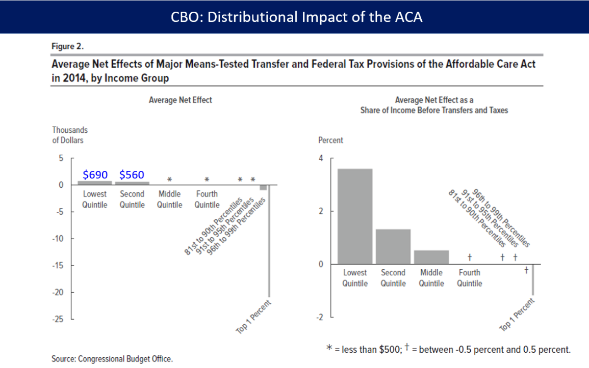 PPACA reduced income inequality measured after taxes, due to the income tax surcharges and subsidies.[186] CBO estimated that subsidies paid under the law in 2016 averaged $4,240 per person for 10 million individuals receiving them, roughly $42 billion. The tax subsidy for the employer market, was approximately $1,700 per person in 2016, or $266 billion total.[174]