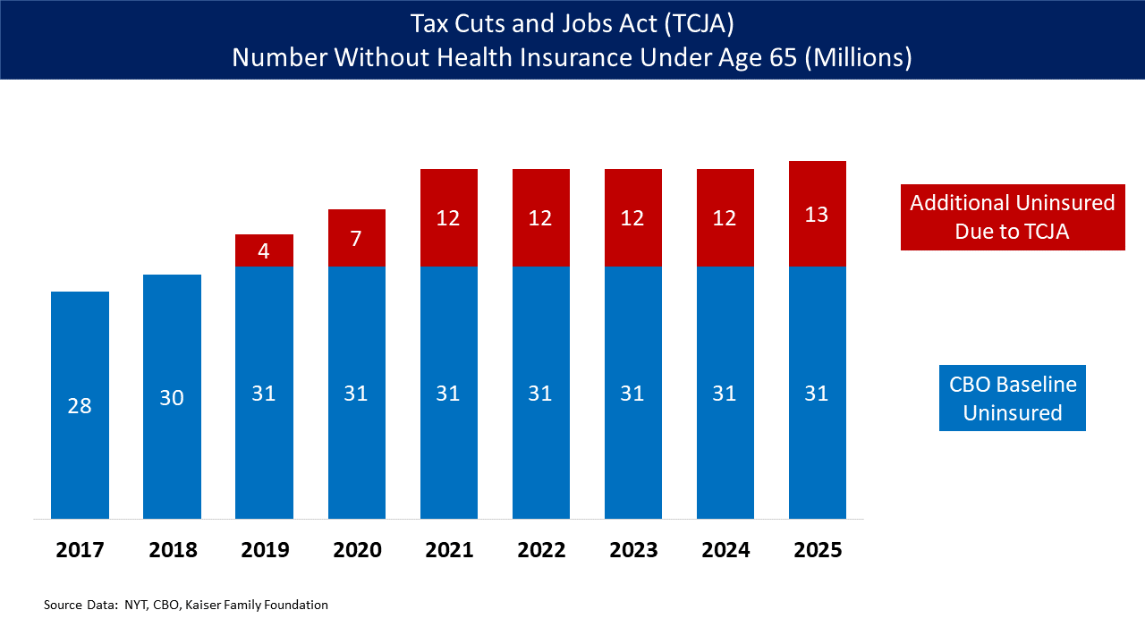 More than 9.2 million people (3.0 million new customers and 6.2 million returning) enrolled on the national exchange in 2017, down some 400,000 from 2016. This decline was due primarily to the election of President Trump.[448] The eleven states that run their own exchanges signed up about 3 million more.[448] The IRS announced that it would not require that tax returns indicate a person has health insurance, reducing the effectiveness of the individual mandate, in response to Trump's executive order.[449] The CBO reported in March that the healthcare exchanges were expected to be stable.[413] In May the House voted to repeal PPACA using the American Health Care Act.[450][451] The individual mandate was repealed starting in 2019 via the Tax Cuts and Jobs Act.[41] The CBO estimated that the repeal would cause 13 million fewer people to have health insurance in 2027.[452]