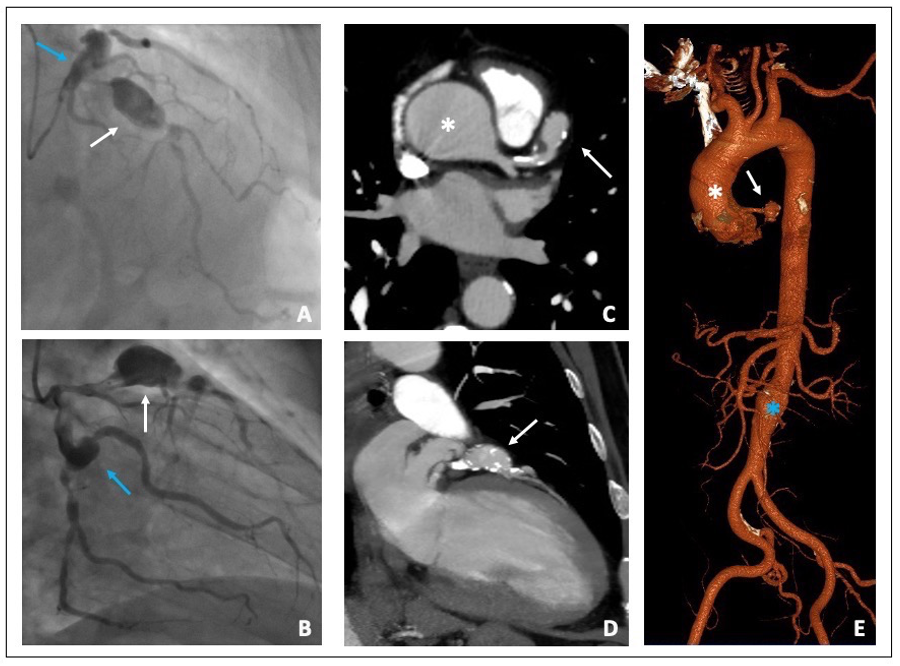 Figure 2. (A,B) Coronary angiography. (A) Proximal LAD giant aneurysm (white arrow) followed by a severe stenosis. Proximal left circumflex artery ectasia (blue arrow). (B) Proximal left circumflex artery ectasia (blue arrow) followed by a severe stenosis of the distal segment. Proximal LAD giant aneurysm (white arrow) (C,D) MSCTA Cardiac short and long axis view showing both ascending aorta (white asterisk) and LAD aneurysms (white arrow). (E) 3D aortic reconstruction image: Ascending (white asterisk) and infra-renal aortic aneurysms (blue asterisk) and LAD aneurysm (white arrow). LAD (left anterior descending); MSCTA (multi-slice computed tomography angiography).