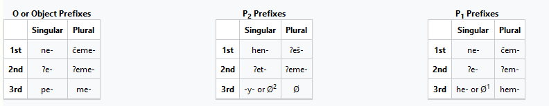 | sing. obj. | Ɂetiy | Ɂevatiy | peɁiy | pevatiy | |||