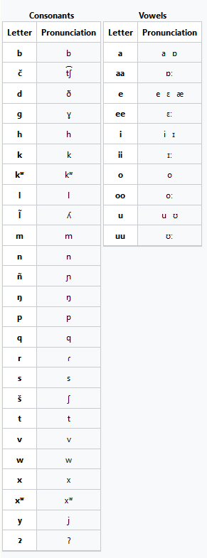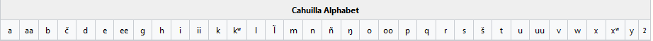 Cahuilla has the following vowel and consonant phonemes (Bright 1965, Saubel and Munro 1980:1-6, Seiler and Hioki 1979: 8-9):[1]