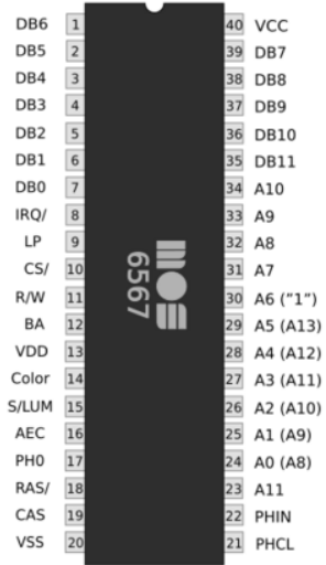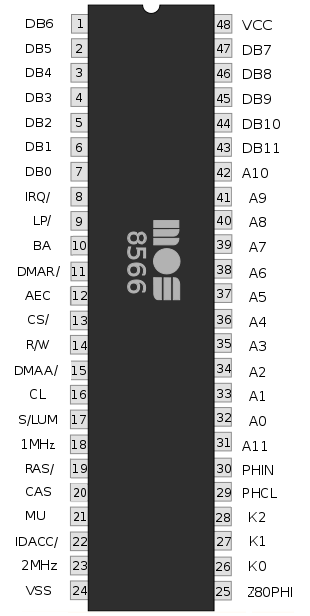 The VIC-II (Video Interface Chip II), specifically known as the MOS Technology 6567/8562/8564 (NTSC versions), 6569/8565/8566 (PAL), is the microchip tasked with generating Y/C video signals (combined to composite video in the RF modulator) and DRAM refresh signals in the Commodore 64 and C128 home computers. Succeeding MOS's original VIC (used in the VIC-20), the VIC-II was one of the two chips mainly responsible for the C64's success (the other chip being the 6581 SID).