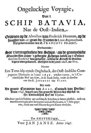 On 27 October 1628, the newly built Batavia, commissioned by the Dutch East India Company, sailed from Texel[1] for the Dutch East Indies, to obtain spices. It sailed under commandeur and opperkoopman (upper- or senior merchant) Francisco Pelsaert, with Ariaen Jacobsz serving as skipper. These two had previously encountered each other in Surat, India. Some animosity had developed between them in Surat after Jacobsz became drunk and insulted Pelsaert in front of other merchants, leading to a public dressing-down for Jacobsz by Pelsaert.[2] Also on board was the onderkoopman (under- or junior merchant) Jeronimus Cornelisz, a bankrupt pharmacist (a.k.a. heretic apothecary[3]) from Haarlem who was fleeing the Netherlands, in fear of arrest because of his heretical beliefs associated with the painter Johannes van der Beeck, also known as Torrentius.