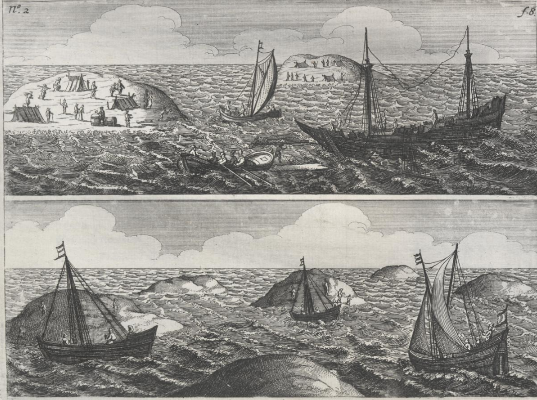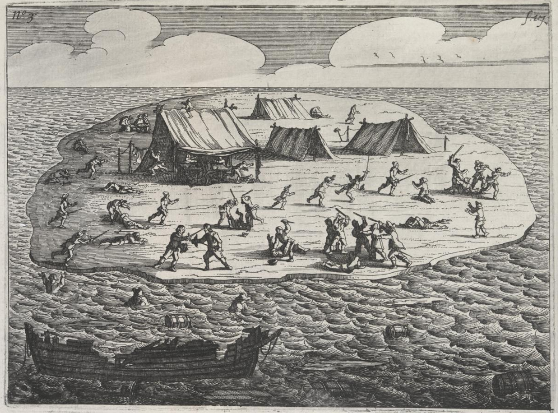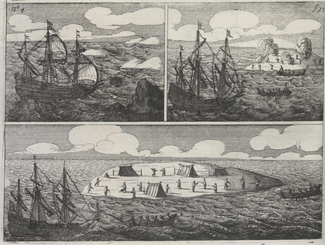 These five woodcuts are from the 1647 edition of Pelsaert, F., & Vliet, J. Ongeluckige voyagie, van 't schip Batavia, nae de Oost-Indien : Gebleven op de Abrolhos van Frederick Houtman ... vytgevaren onder den E. Francoys Pelsert ... : Nevens Een treur-bly-eynde ongheluck, des Oost-Indische Compagnies dienaers in 't jaer 1636. weder-varen ... : Als mede De groote tyrranye van Abas, coninck van Persien, anno 1645 ... / alles door een liefhebber uyt verscheyde schriften te samen ghestelt ... oock met veel schoone kopere platen verrijckt. Tot Amsterdam: Voor Jan Jansz. The original is held in the State Library of New South Wales SAFE/C 530