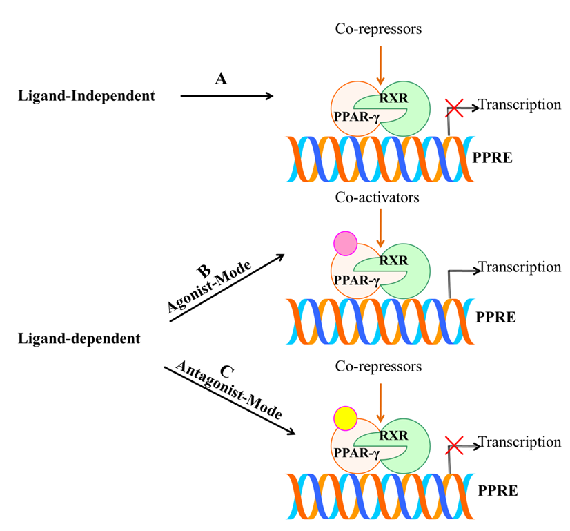 Figure 5. Schematic representation of activation of PPAR-γ receptor through ligand dependent or independent mechanisms. (A) Ligand-independent mechanism does not involve the active participation of ligand and co-repressors bind to unliganded PPAR-γ which repress the gene expression by chromatin remodeling. (B) Agonist mode of action involves the binding of ligand to LBD of PPAR-γ with the help of co-activators that further leads to transcription of targeted genes. (C) Antagonist mode of action also involves the binding of ligand without leading to transactivation activity due to the presence of co-repressors.