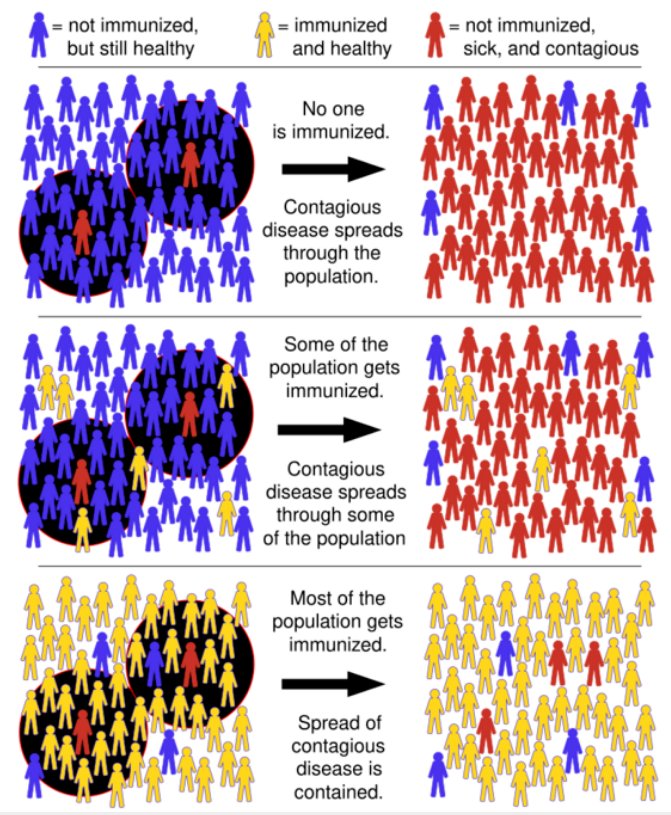 Herd immunity, or herd effect, refers to the indirect protection that immunized community members provide to non-immunized members in preventing the spread of contagious disease. The greater the number of immunized individuals, the less likely an outbreak can occur because there are fewer susceptible contacts. In epidemiology, herd immunity is known as a dependent happening because it influences transmission over time. As a pathogen that confers immunity to the survivors moves through a susceptible population, the number of susceptible contacts declines. Even if susceptible individuals remain, their contacts are likely to be immunized, preventing any further spread of the infection.[7][12] The proportion of immune individuals in a population above which a disease may no longer persist is the herd immunity threshold. Its value varies with the virulence of the disease, the efficacy of the vaccine, and the contact parameter for the population.[13] That is not to say that an outbreak can't occur, but it will be limited.[12][14][15]