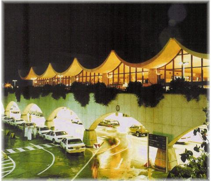 Designed by the Bangladeshi-American engineer Fazlur Rahman Khan of the architectural firm Skidmore, Owings & Merrill LLP (SOM), it is known for its tent-like roof structure, engineered by Horst Berger while part of Geiger Berger Associates.[5] Ten modules, each consisting of 21 "tents" of white colored Teflon-coated fiberglass fabric suspended from pylons, are grouped together into two blocks of five modules and separated by a landscaped mall between the blocks. Only customs, baggage handling and similar facilities are located in an air-conditioned building. The vast majority of the complex, called "Terminal Support Area", is a flexible, open area, conceived to function like a village, complete with souk (market) and mosque. Not enclosed by walls, this area is sheltered from the intense sun while allowing for natural ventilation; because of this, some consider it to be a green, environmentally-friendly building.[6]