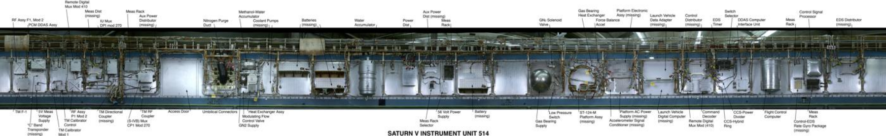 The Saturn V Instrument Unit is a ring-shaped structure fitted to the top of the Saturn V rocket's third stage (S-IVB) and the Saturn IB's second stage (also an S-IVB). It was immediately below the SLA (Spacecraft/Lunar Module Adapter) panels that contained the Lunar Module. The Instrument Unit contains the guidance system for the Saturn V rocket. Some of the electronics contained within the Instrument Unit are a digital computer, analog flight control computer, emergency detection system, inertial guidance platform, control accelerometers and control rate gyros. The instrument unit (IU) for Saturn V was designed by NASA at Marshall Space Flight Center (MSFC) and was developed from the Saturn I IU. NASA's contractor to construct the Saturn V Instrument Unit was International Business Machines (IBM). One of the unused Instrument Units is currently on display at the Steven F. Udvar-Hazy Center in Chantilly, Virginia. The plaque for the Unit has the following inscription: The Saturn V rocket, which sent astronauts to the Moon, used inertial guidance, a self-contained system that guided the rocket's trajectory. The rocket booster had a guidance system separate from those on the command and lunar modules. It was contained in an instrument unit like this one, a ring located between the rocket's third stage and the command and lunar modules. The ring contained the basic guidance system components—a stable platform, accelerometers, a digital computer, and control electronics—as well as radar, telemetry, and other units. The instrument unit's stable platform was based on an experimental unit for the German V-2 rocket of World War II. The Bendix Corporation produced the platform, while IBM designed and built the unit's digital computer.